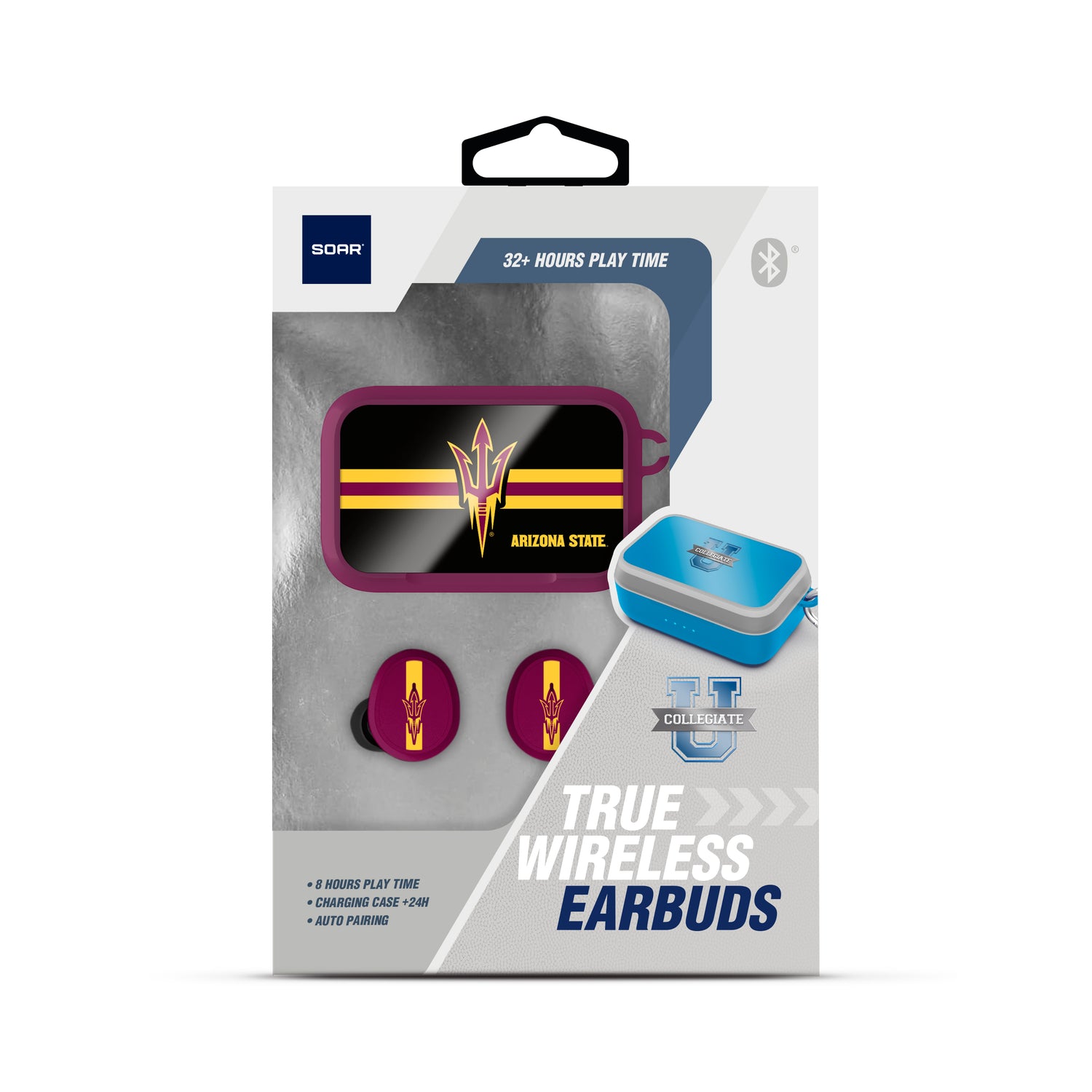 The SOAR NCAA Wireless Sports Earbuds offer a comfortable fit with the convenience of wireless freedom. These earbuds are perfect for active lifestyles, featuring a secure fit for any workout or outdoor activity. With seamless Bluetooth connectivity, enjoy high-quality sound while displaying your favorite Arizona State Sun Devils team logo. The compact charging case ensures your earbuds are always ready to go, providing hours of listening on a single charge. Ideal for sports enthusiasts and NCAA fans alike, these earbuds combine style, functionality, and team pride.