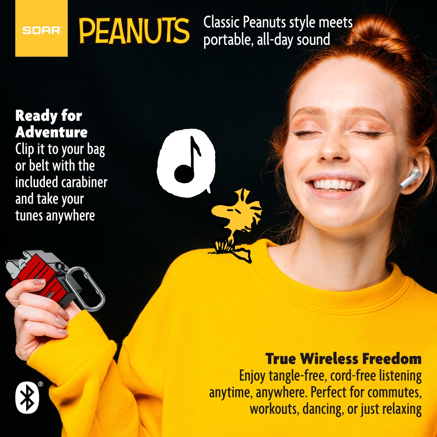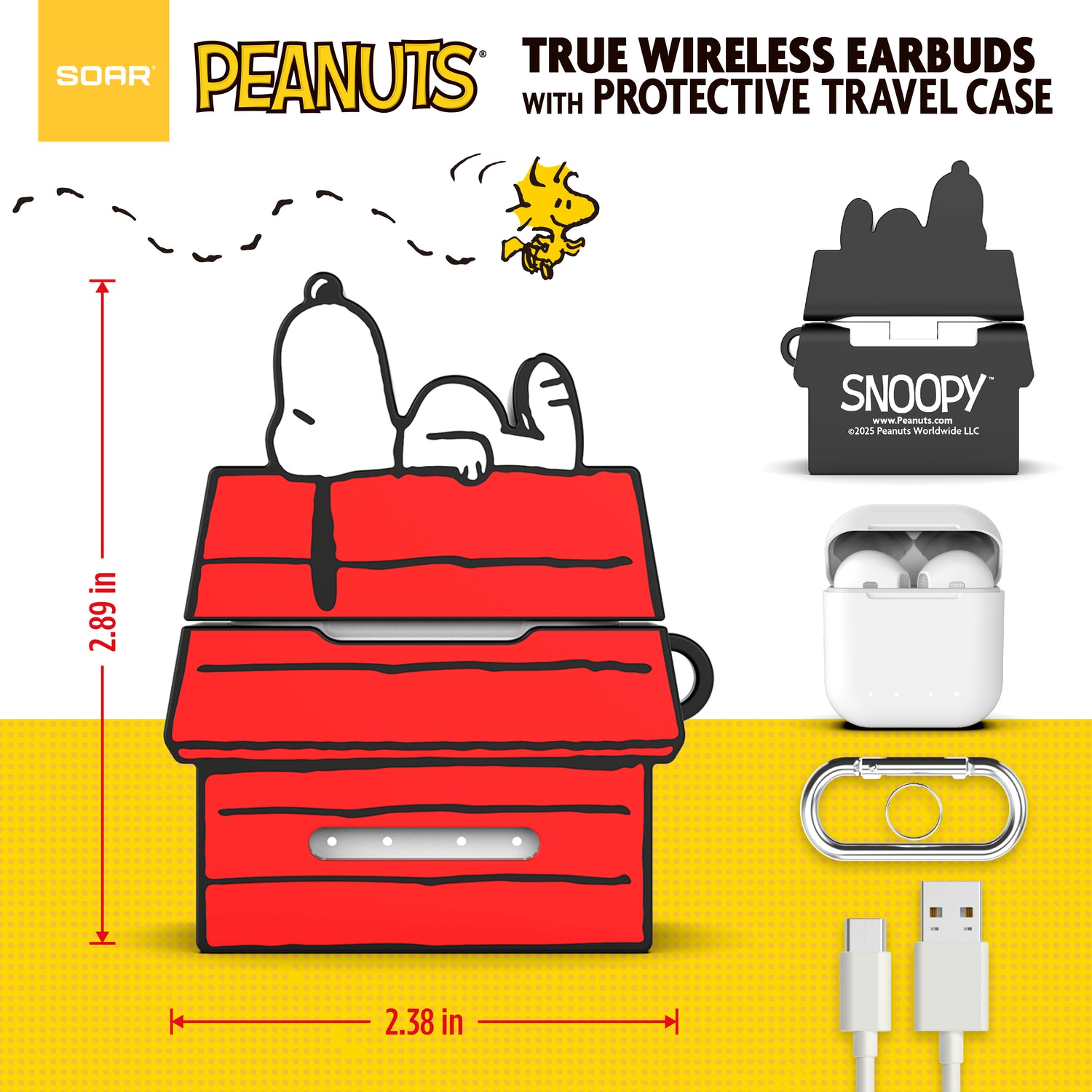 - True wireless earbuds with Snoopy’s house case: Enjoy premium sound and playful Peanuts design with these compact earbuds, safely stored in a molded charging case shaped like Snoopy’s iconic red doghouse.