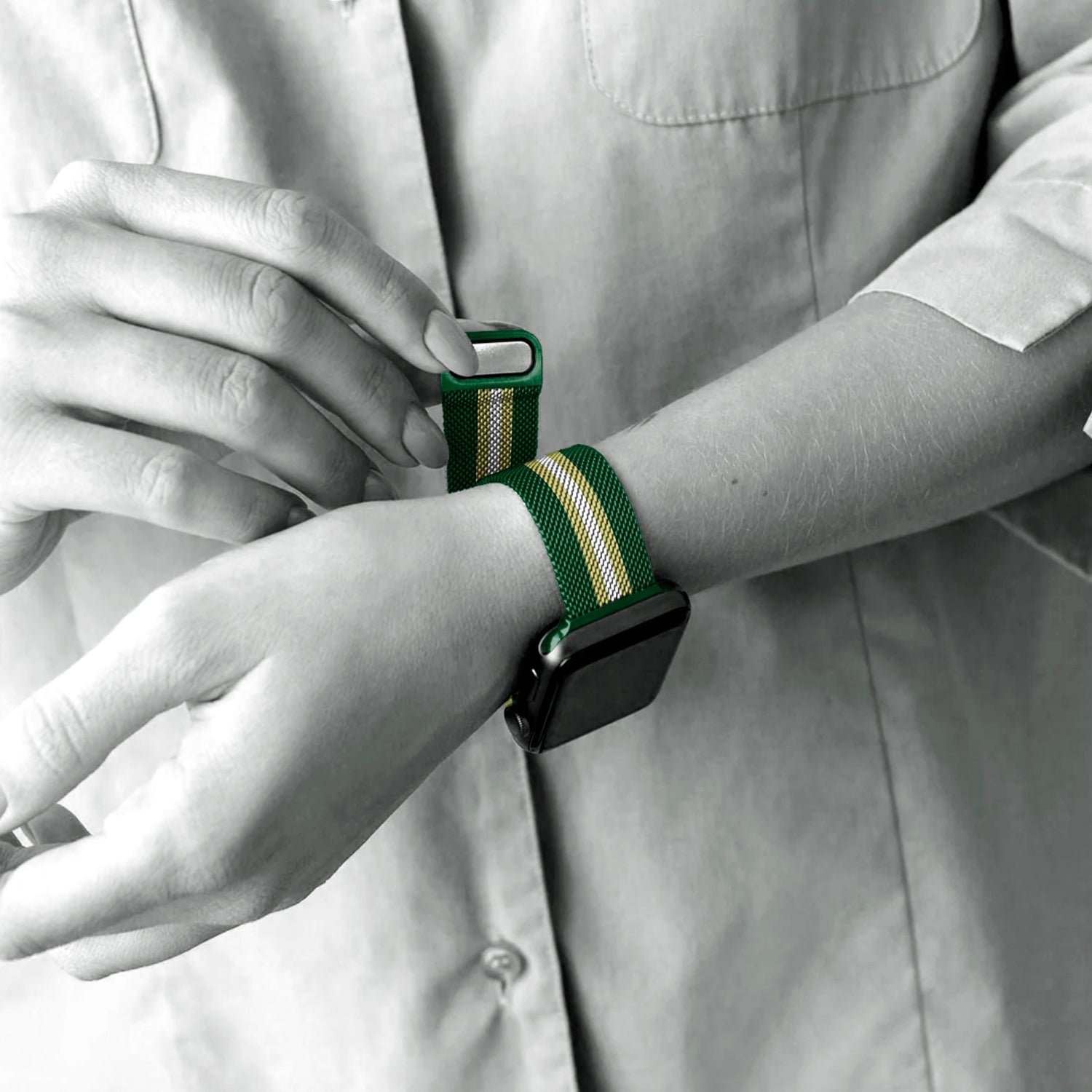 Support your team in style with the NCAA Striped Metallic Watch Band (42mm), featuring your Colorado State Rams logo. Designed with a durable stainless steel band, it offers a secure magnetic closure and a sleek striped look. Compatible with Apple Watches, its adjustable one-size-fits-most design ensures maximum comfort. Perfect for everyday wear or game-day vibes!