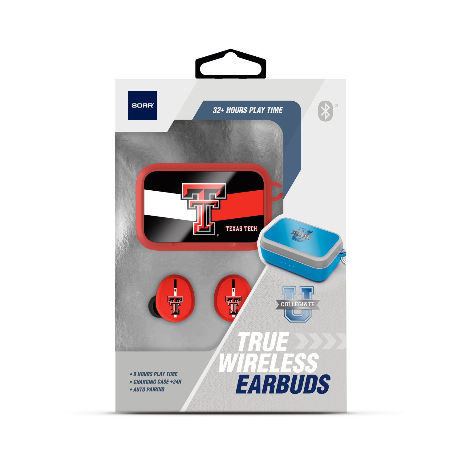 The SOAR NCAA Wireless Sports Earbuds offer a comfortable fit with the convenience of wireless freedom. These earbuds are perfect for active lifestyles, featuring a secure fit for any workout or outdoor activity. With seamless Bluetooth connectivity, enjoy high-quality sound while displaying your favorite Texas Tech Red Raiders team logo. The compact charging case ensures your earbuds are always ready to go, providing hours of listening on a single charge. Ideal for sports enthusiasts and NCAA fans alike, these earbuds combine style, functionality, and team pride.