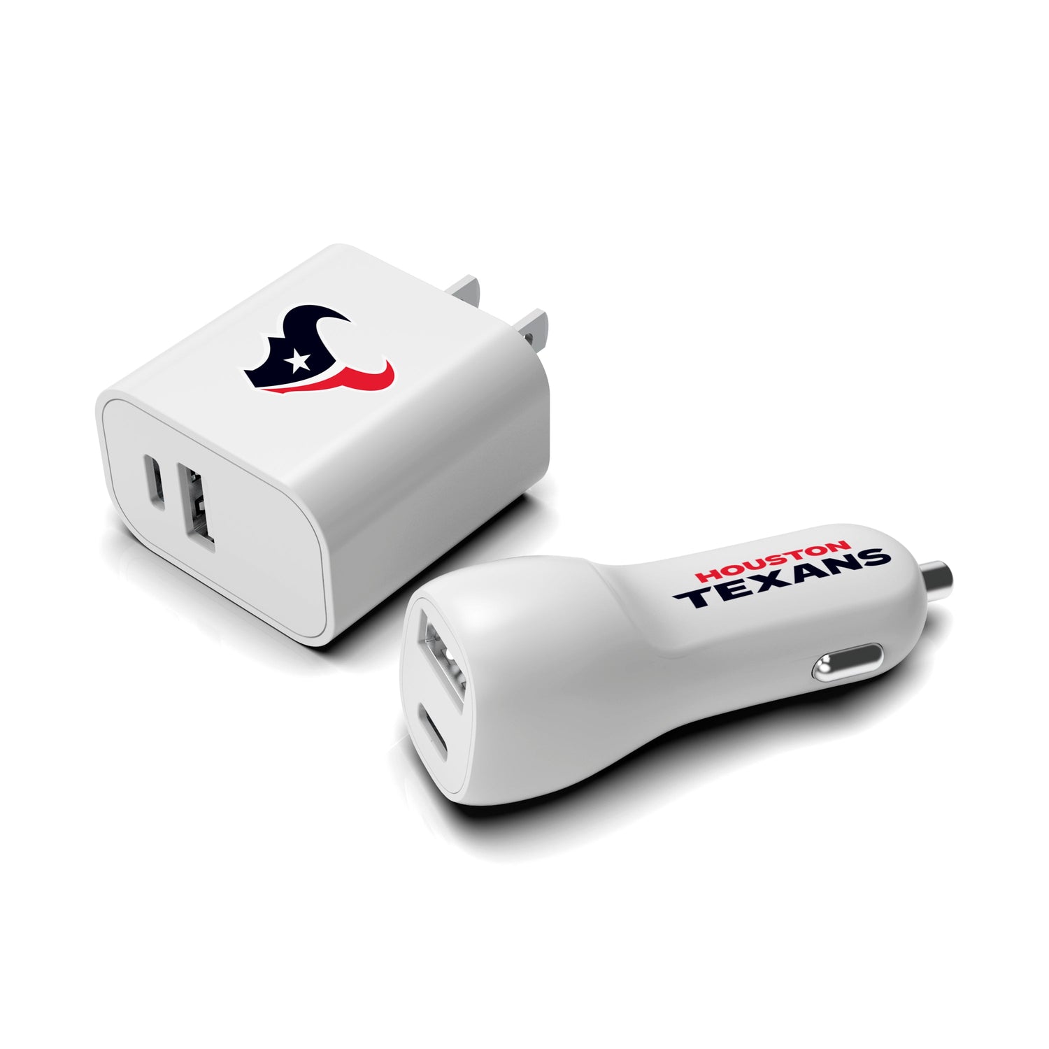 Stay powered on the go with the NFL Dual USB & Type-C Charger Combo, featuring Houston Texans logo. This versatile pack includes both a car charger and a wall charger, offering rapid 2.1 Amp charging for your devices. Designed with overcharge protection, it ensures safe and efficient charging every time. Perfect for home, office, or travel use.