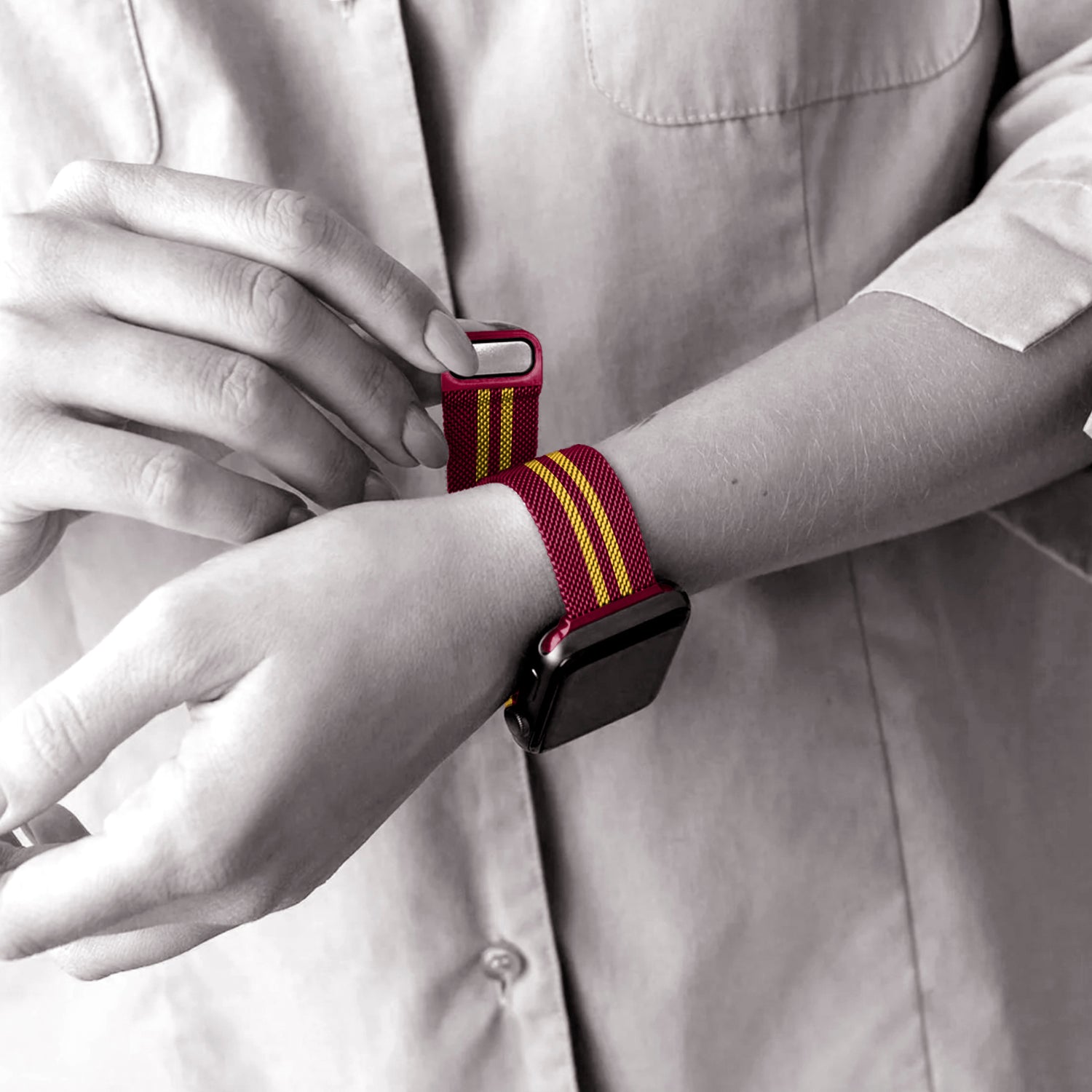 Support your team in style with the NCAA Striped Metallic Watch Band (38mm), featuring your Iowa State Cyclones logo. Designed with a durable stainless steel band, it offers a secure magnetic closure and a sleek striped look. Compatible with Apple Watches, its adjustable one-size-fits-most design ensures maximum comfort. Perfect for everyday wear or game-day vibes!