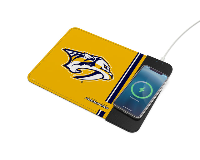 Upgrade your workspace with the NHL Wireless Charging Mousepad featuring Nashville Predators logo! This sleek and functional mousepad delivers 10W Qi-certified wireless charging, ensuring fast and efficient power for your devices. Its compact design works perfectly with slim phone cases and keeps your desk tidy. Ideal for work, gaming, or gifting, this mousepad combines practicality and team pride in one stylish accessory.