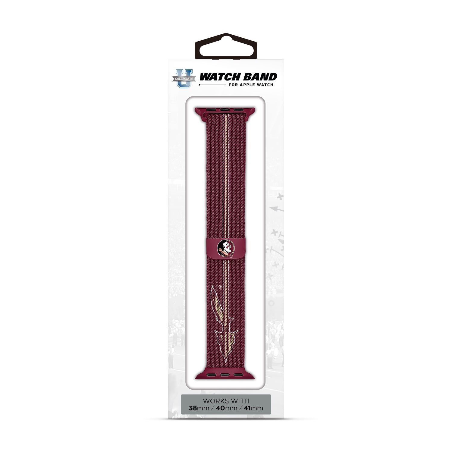 Support your team in style with the NCAA Striped Metallic Watch Band (38mm), featuring your Florida State Seminoles logo. Designed with a durable stainless steel band, it offers a secure magnetic closure and a sleek striped look. Compatible with Apple Watches, its adjustable one-size-fits-most design ensures maximum comfort. Perfect for everyday wear or game-day vibes!
