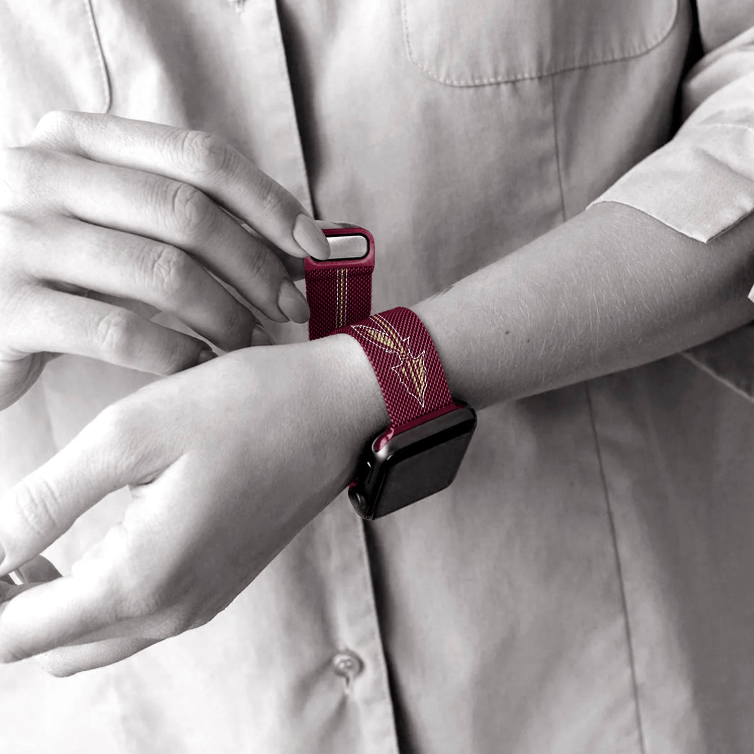 Support your team in style with the NCAA Striped Metallic Watch Band (42mm), featuring your Florida State Seminoles logo. Designed with a durable stainless steel band, it offers a secure magnetic closure and a sleek striped look. Compatible with Apple Watches, its adjustable one-size-fits-most design ensures maximum comfort. Perfect for everyday wear or game-day vibes!