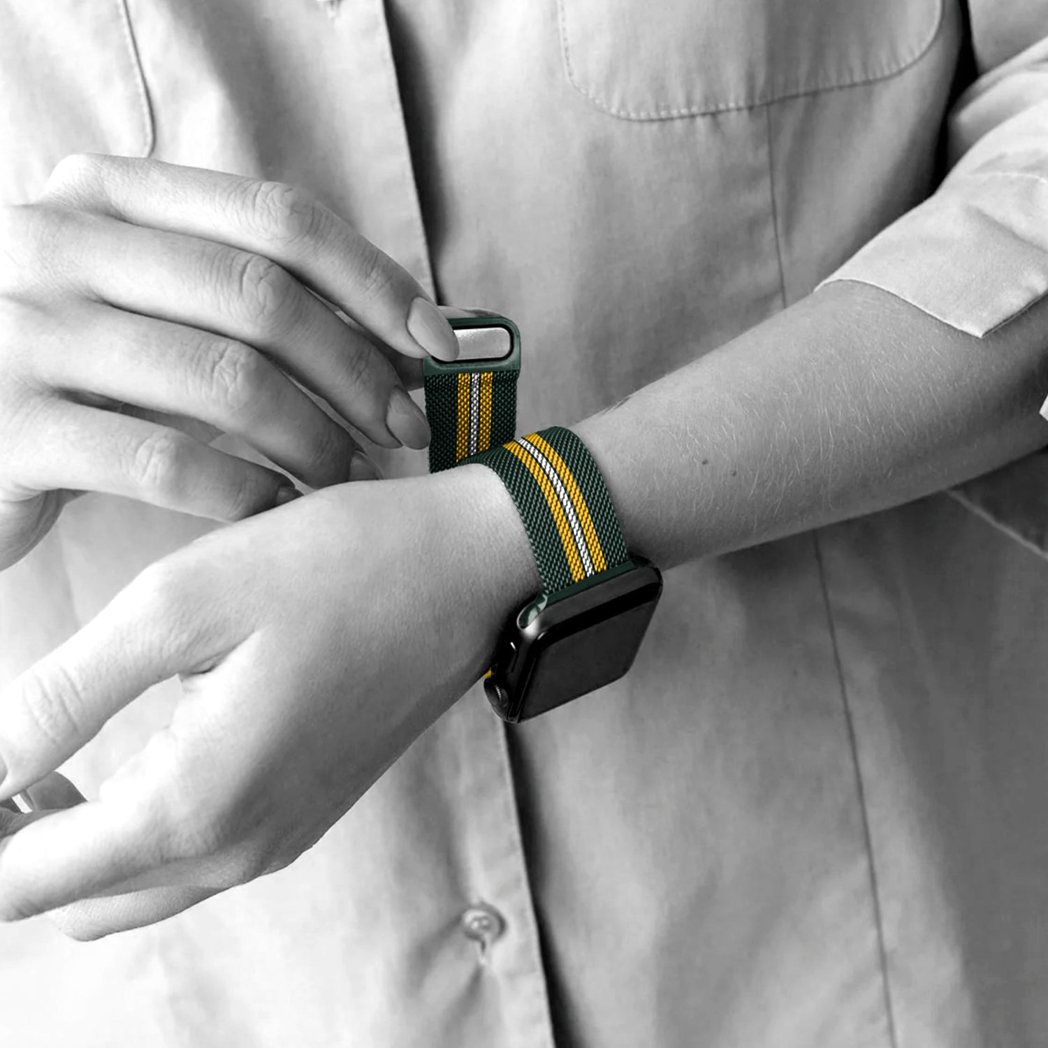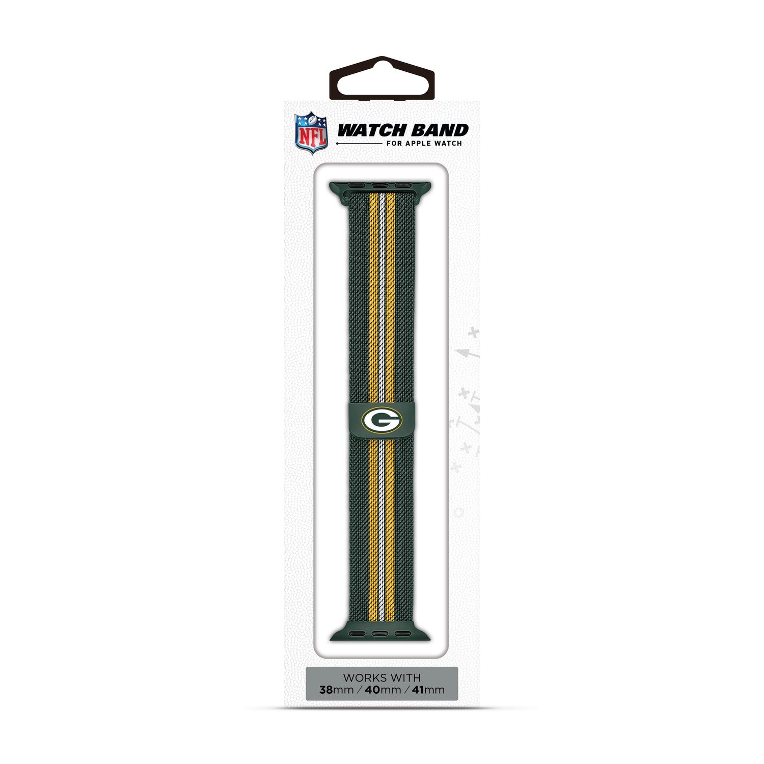 Support your team in style with the NFL Striped Metallic Watch Band (38mm), featuring Green Bay Packers logo. Designed with a durable stainless steel band, it offers a secure magnetic closure and a sleek striped look. Compatible with Apple Watches, its adjustable one-size-fits-most design ensures maximum comfort. Perfect for everyday wear or game-day vibes!