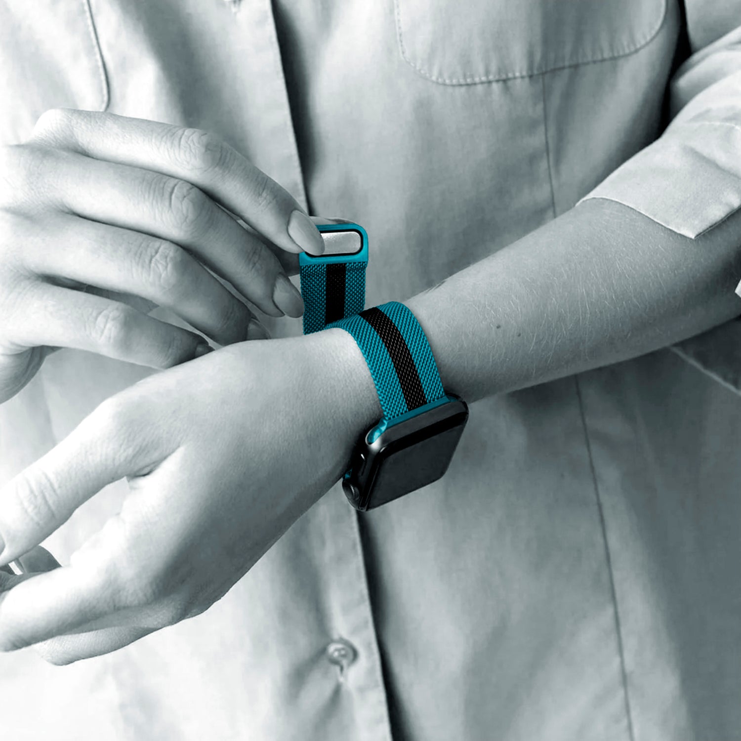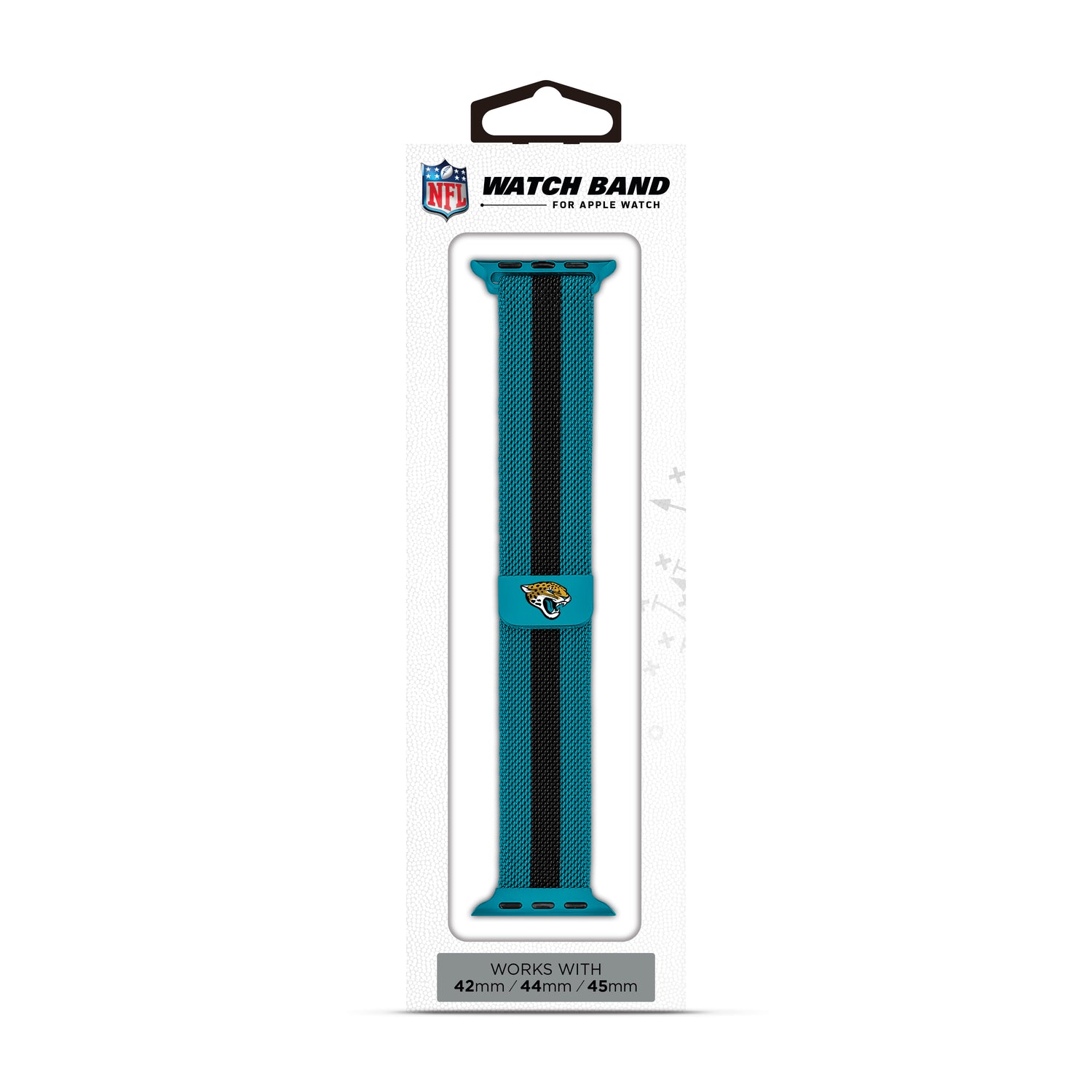 Support your team in style with the NFL Striped Metallic Watch Band (42mm), featuring Jacksonville Jaguars logo. Designed with a durable stainless steel band, it offers a secure magnetic closure and a sleek striped look. Compatible with Apple Watches, its adjustable one-size-fits-most design ensures maximum comfort. Perfect for everyday wear or game-day vibes!