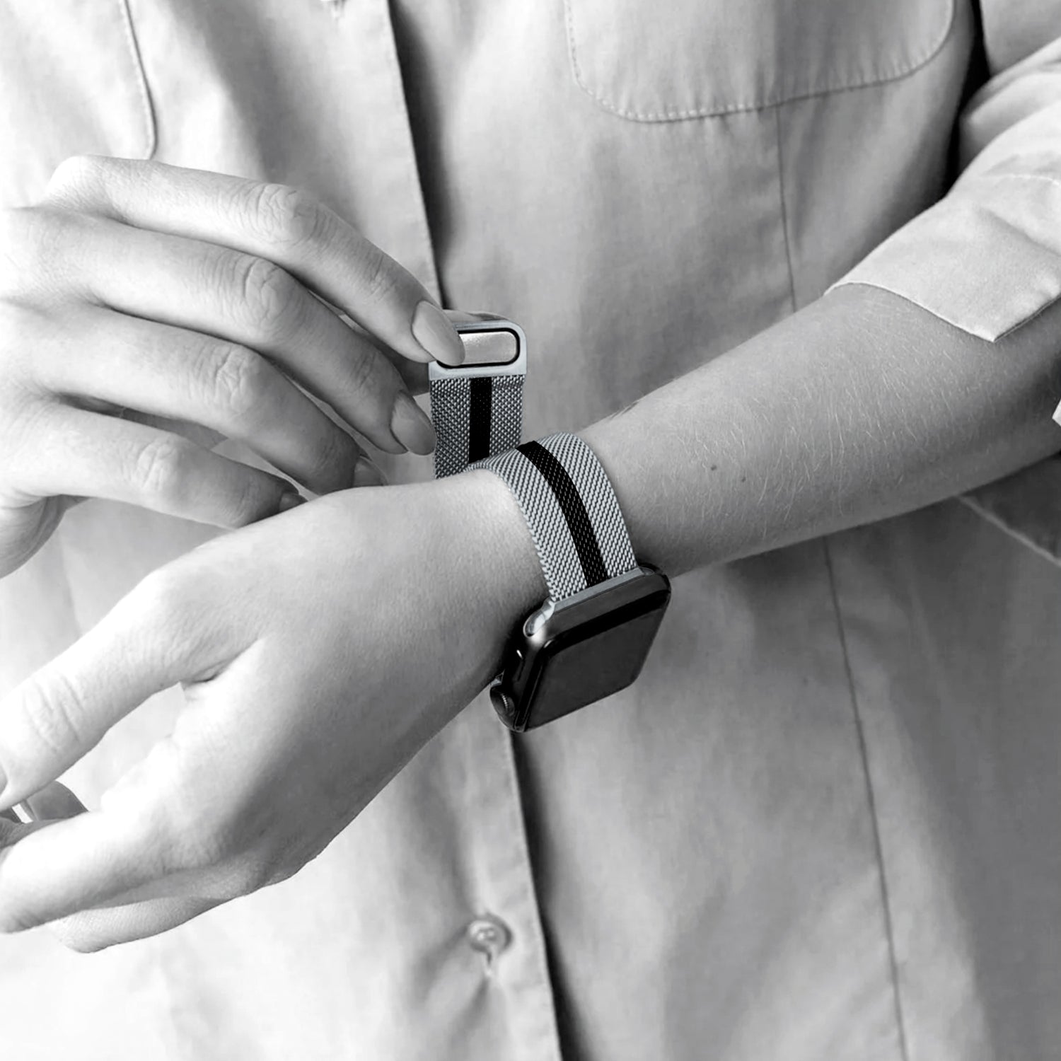 Support your team in style with the NFL Striped Metallic Watch Band (42mm), featuring Las Vegas Raiders logo. Designed with a durable stainless steel band, it offers a secure magnetic closure and a sleek striped look. Compatible with Apple Watches, its adjustable one-size-fits-most design ensures maximum comfort. Perfect for everyday wear or game-day vibes!
