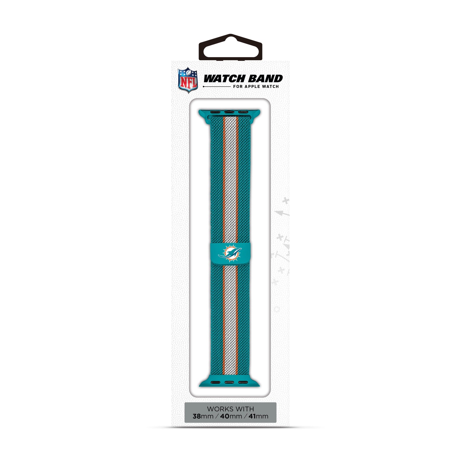 Support your team in style with the NFL Striped Metallic Watch Band (38mm), featuring Miami Dolphins logo. Designed with a durable stainless steel band, it offers a secure magnetic closure and a sleek striped look. Compatible with Apple Watches, its adjustable one-size-fits-most design ensures maximum comfort. Perfect for everyday wear or game-day vibes!