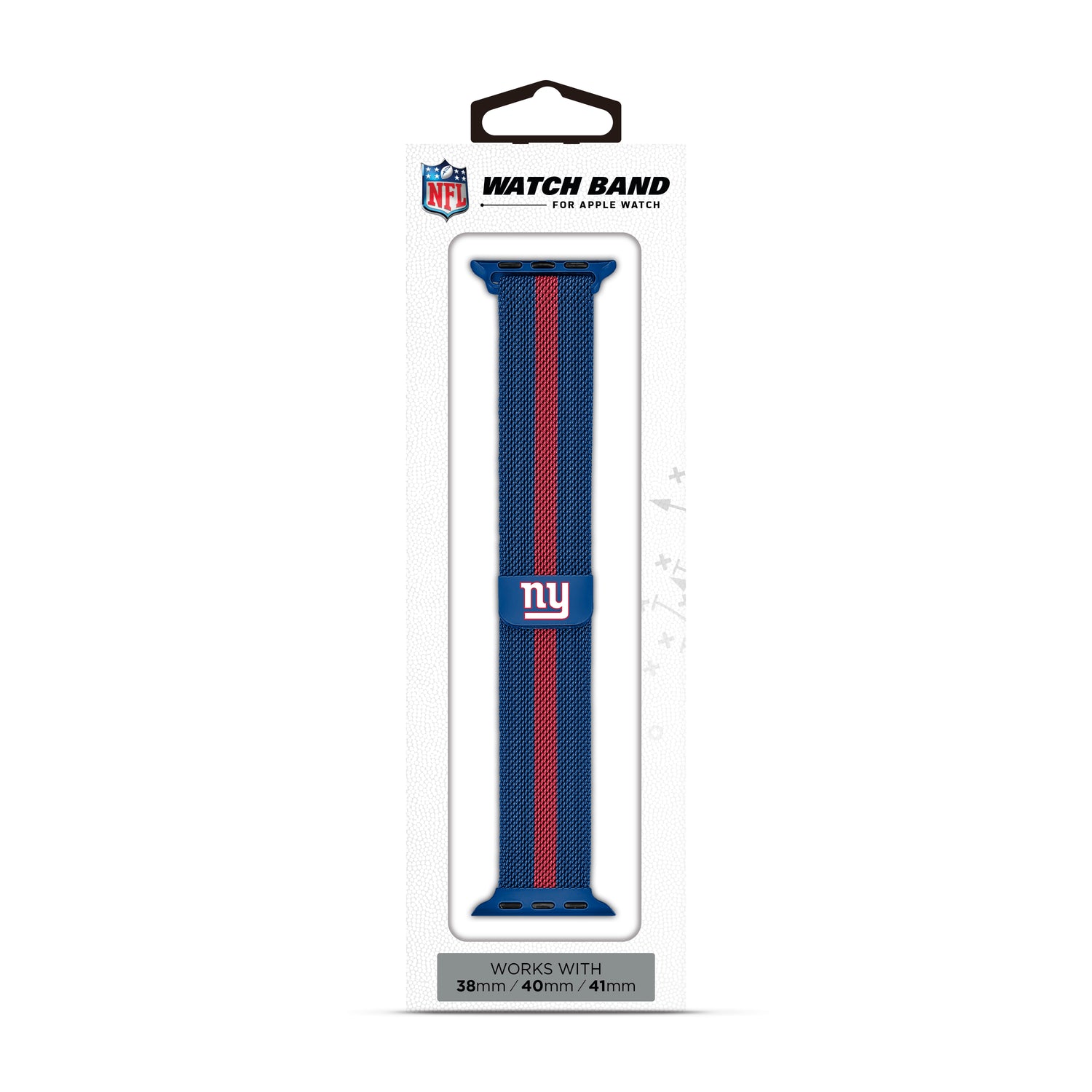 Support your team in style with the NFL Striped Metallic Watch Band (38mm), featuring New York Giants logo. Designed with a durable stainless steel band, it offers a secure magnetic closure and a sleek striped look. Compatible with Apple Watches, its adjustable one-size-fits-most design ensures maximum comfort. Perfect for everyday wear or game-day vibes!