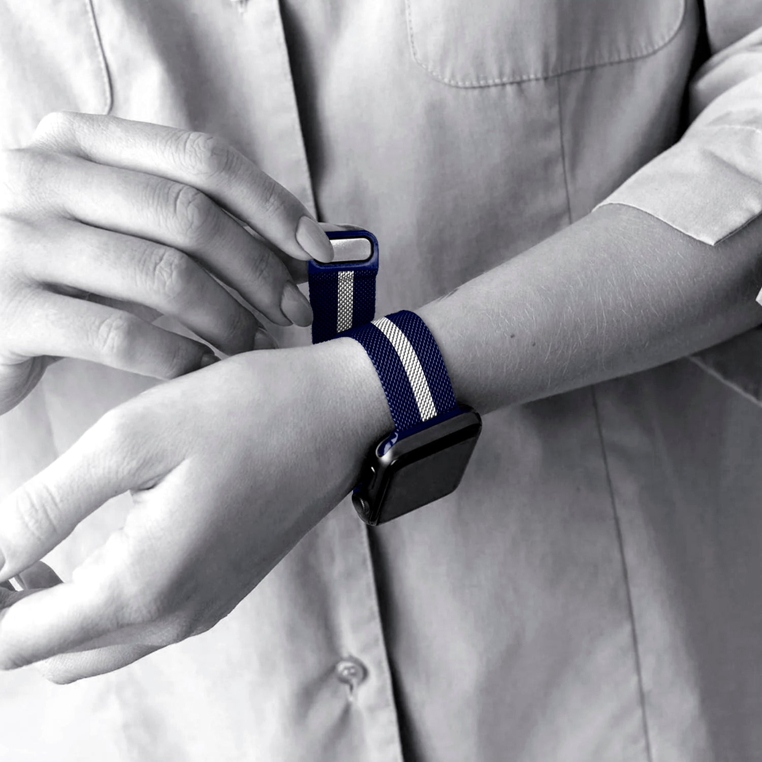 Support your team in style with the NCAA Striped Metallic Watch Band (42mm), featuring your Penn State Nittany Lions logo. Designed with a durable stainless steel band, it offers a secure magnetic closure and a sleek striped look. Compatible with Apple Watches, its adjustable one-size-fits-most design ensures maximum comfort. Perfect for everyday wear or game-day vibes!