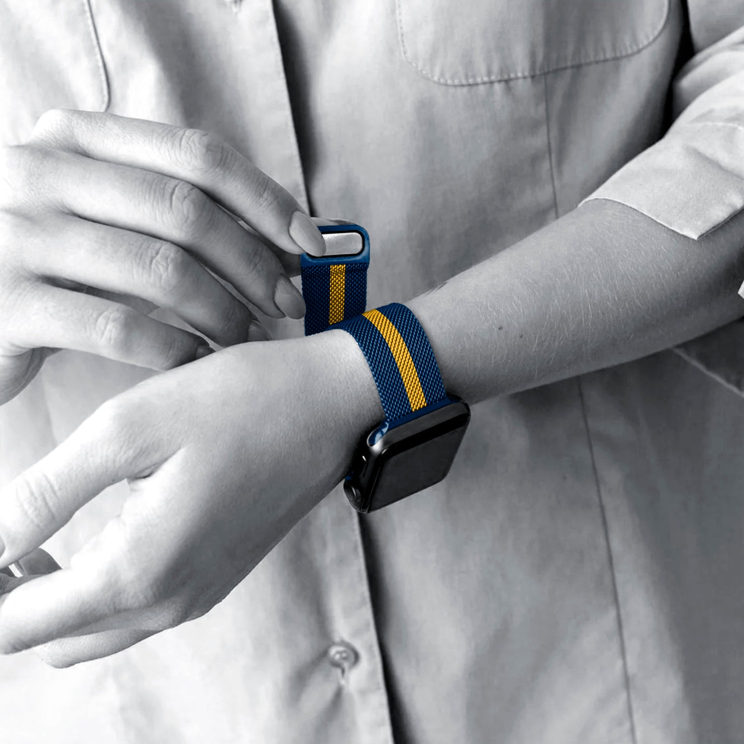 Support your team in style with the NCAA Striped Metallic Watch Band (38mm), featuring your West Virginia Mountaineers logo. Designed with a durable stainless steel band, it offers a secure magnetic closure and a sleek striped look. Compatible with Apple Watches, its adjustable one-size-fits-most design ensures maximum comfort. Perfect for everyday wear or game-day vibes!
