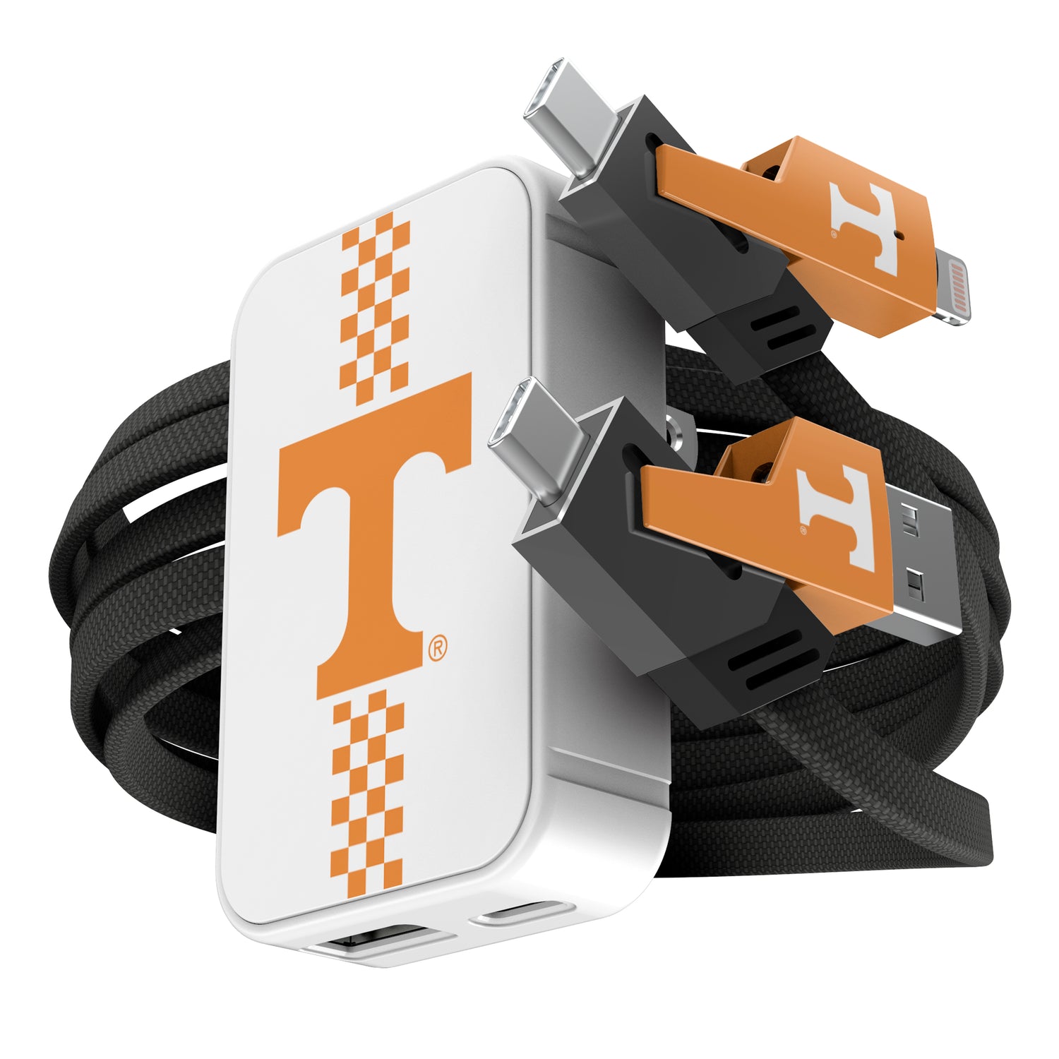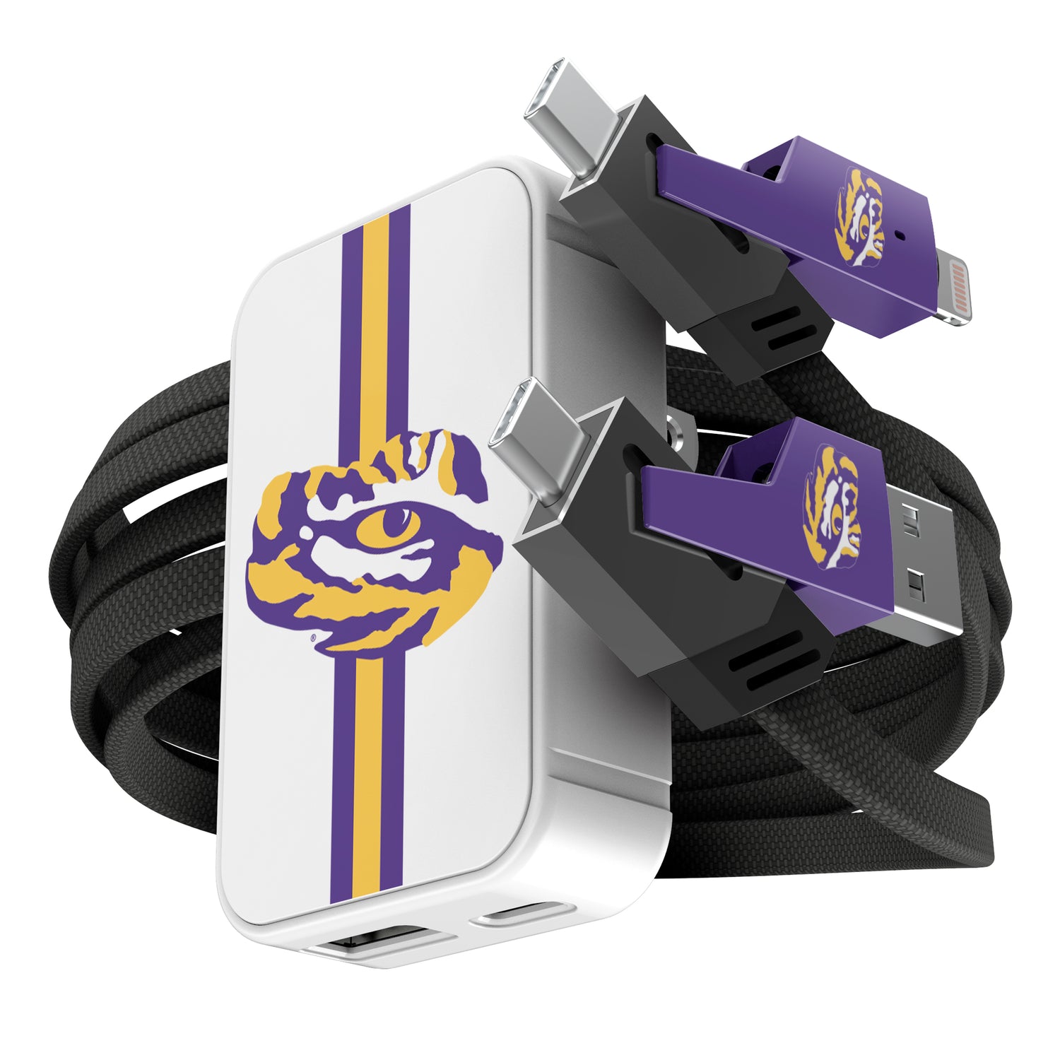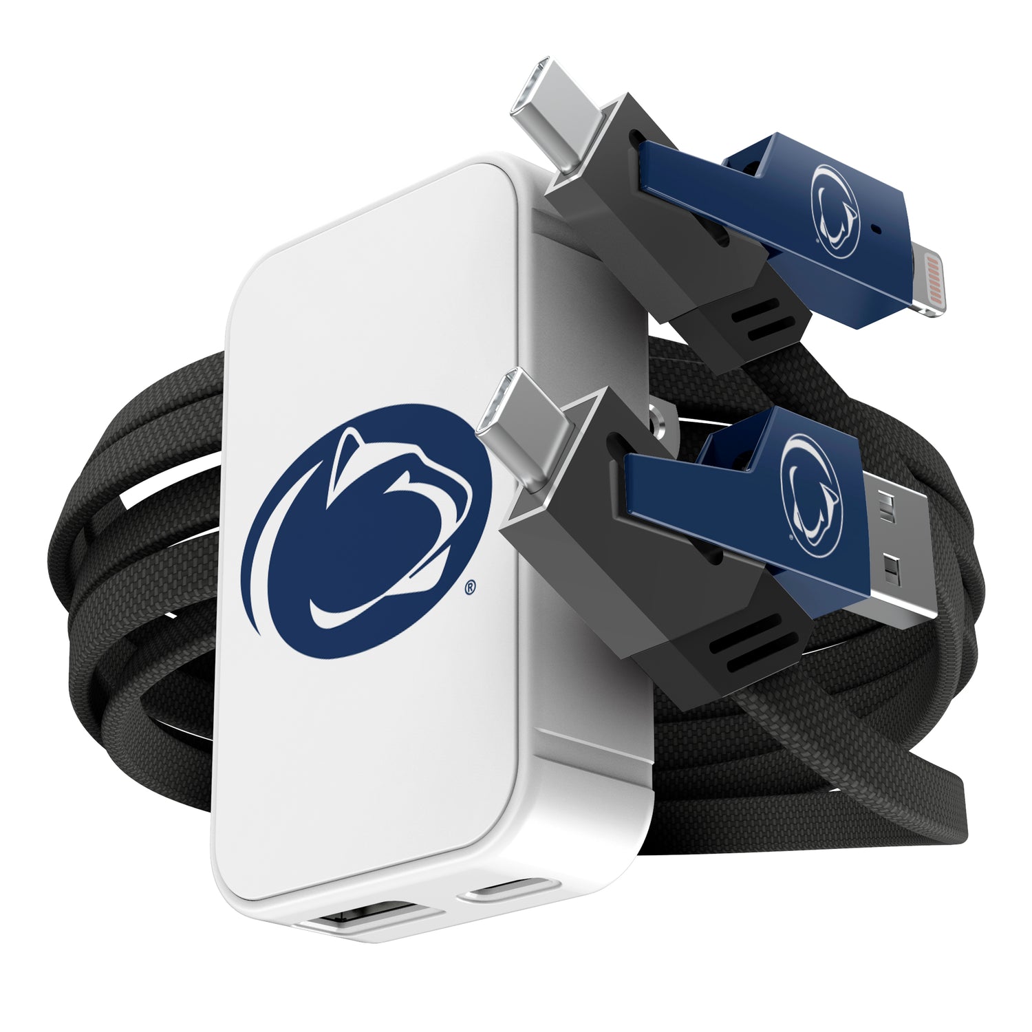 Power up like a pro with this slim wall charger and 4-in-1 cable set, built for convenience and speed. The 38W dual-port charger (USB-C + USB-A) delivers fast, reliable charging in a compact design that fits tight spaces and folds for easy storage. The flat braided cable offers four connection options—USB-C, USB-A, and Lightning—so you’re always covered, no matter your device. With up to 65W power delivery and high-speed data transfer, this set is perfect for game day travel, tailgates, or everyday use. A must-have for any sports fan who needs to stay charged and connected on the go.