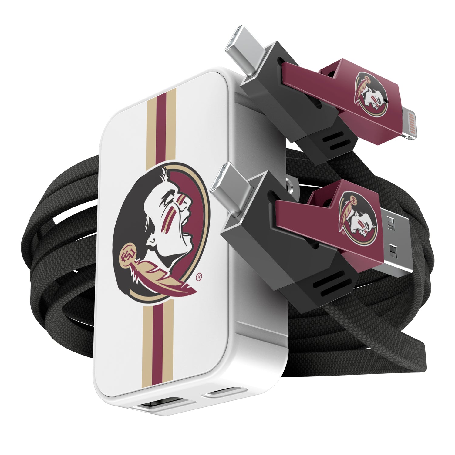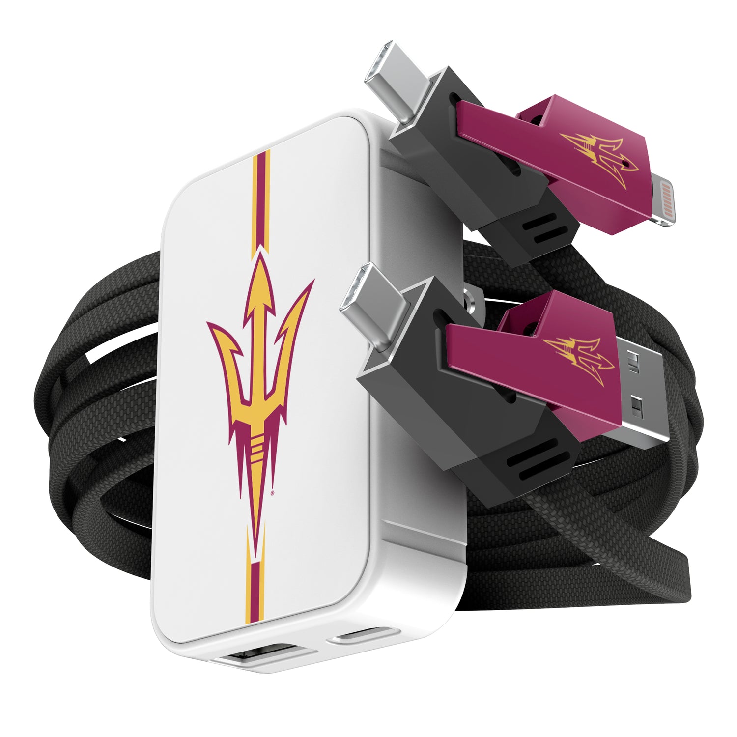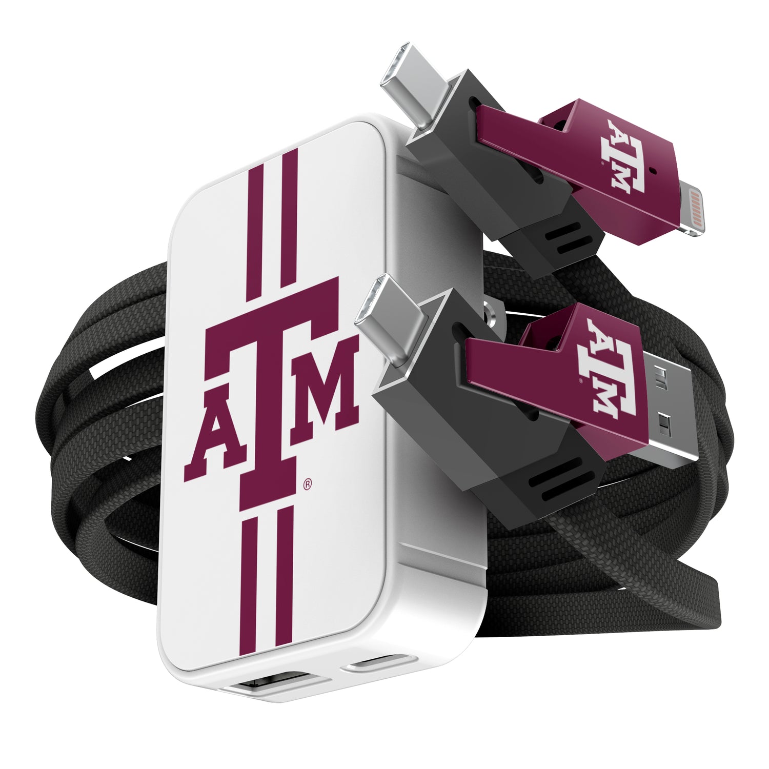 Power up like a pro with this slim wall charger and 4-in-1 cable set, built for convenience and speed. The 38W dual-port charger (USB-C + USB-A) delivers fast, reliable charging in a compact design that fits tight spaces and folds for easy storage. The flat braided cable offers four connection options—USB-C, USB-A, and Lightning—so you’re always covered, no matter your device. With up to 65W power delivery and high-speed data transfer, this set is perfect for game day travel, tailgates, or everyday use. A must-have for any sports fan who needs to stay charged and connected on the go.